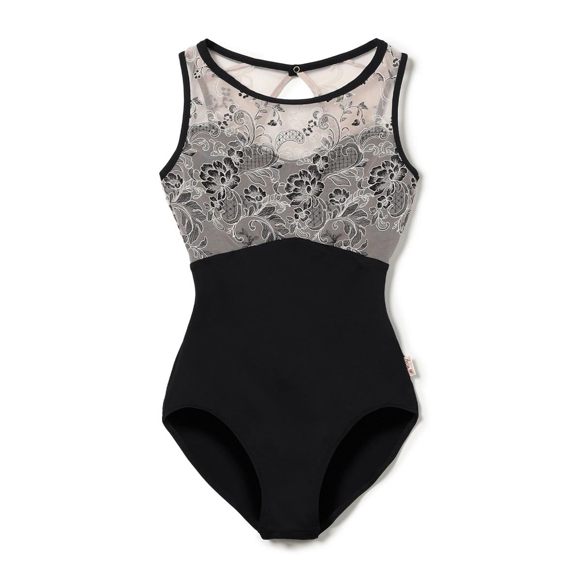 This sleeveless leotard features elegant and luxurious embroidered tulle on the bust and back, with a botanical pattern created in three dimensions using cord yarn.
