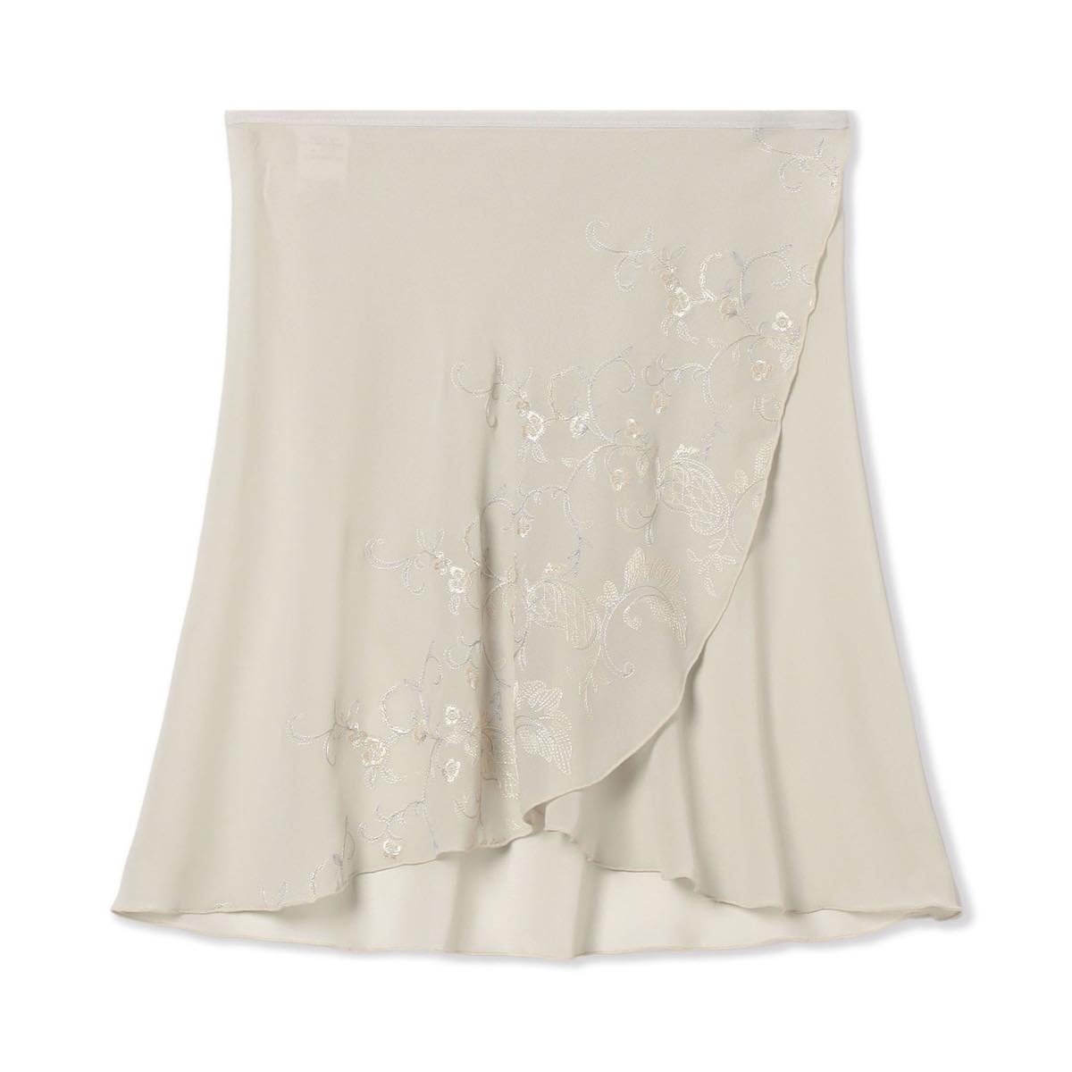A wrap skirt made of embroidered chiffon with a botanical pattern embroidered on the front.