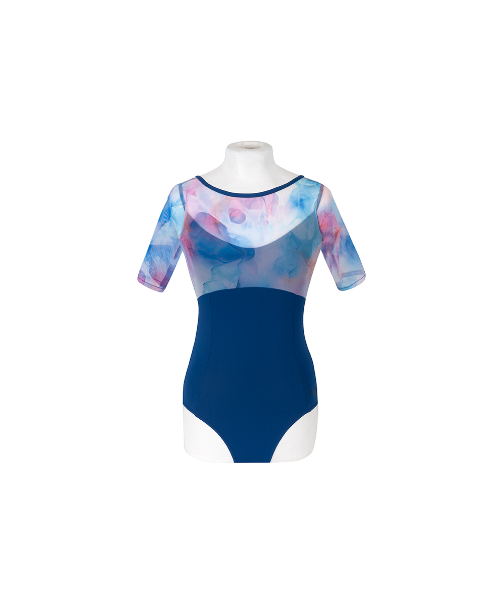 Delicate half-sleeve leotard with a beautiful watercoloured overlay to the front bodice. The open rounded back created with matching coloured binding edging, makes this a truly stunning leotard.